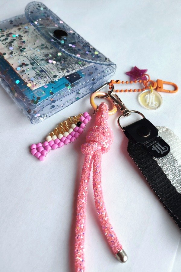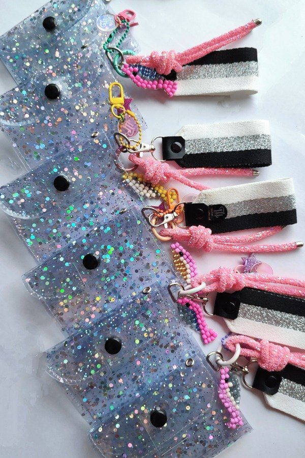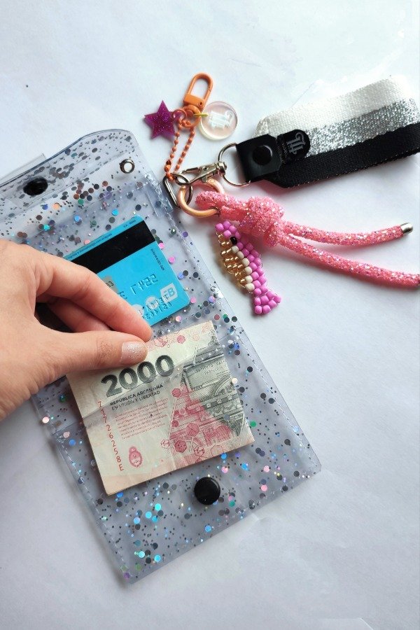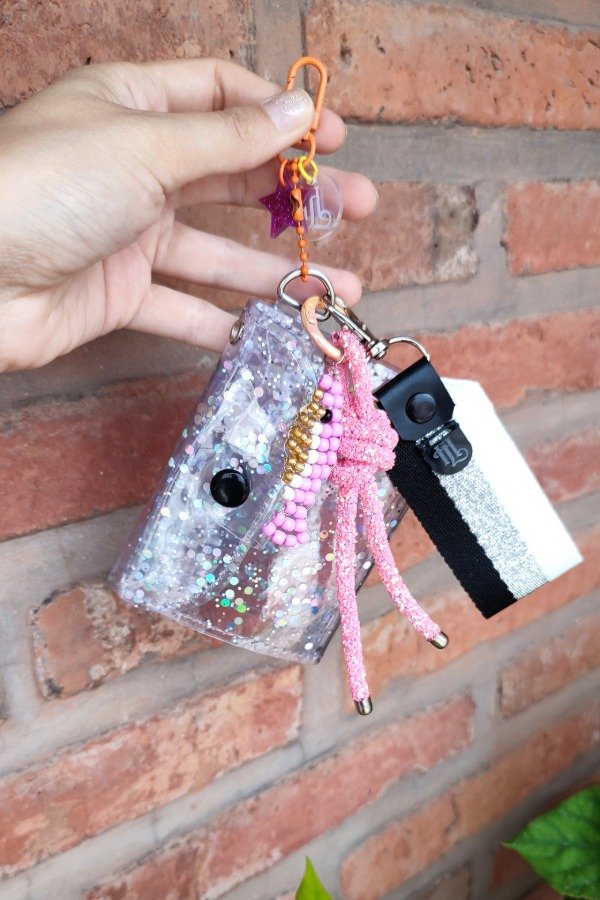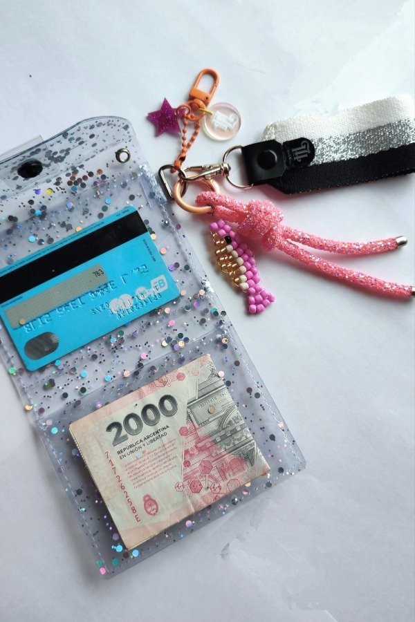 ESTE CHARM VIENE CON MINI TARJETERO HL DE 2 COMPARTIMENTOS EN PLASTICO CRISTAL CON GLITTER QUE SE PLIEGA CON BROCHE PLASTICO NEGRO Y CON ARGOLLA PARA COLGAR.